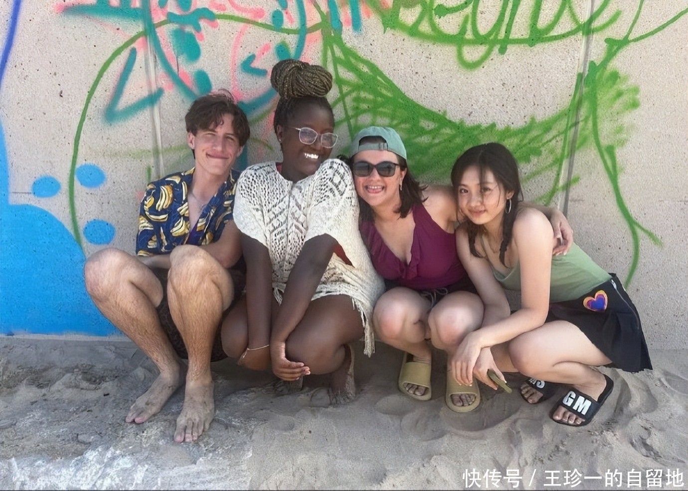 从她晒出的多张照片看,可以看到她和几位女性朋友到海滩上游玩了,她们开心地拍照留念。